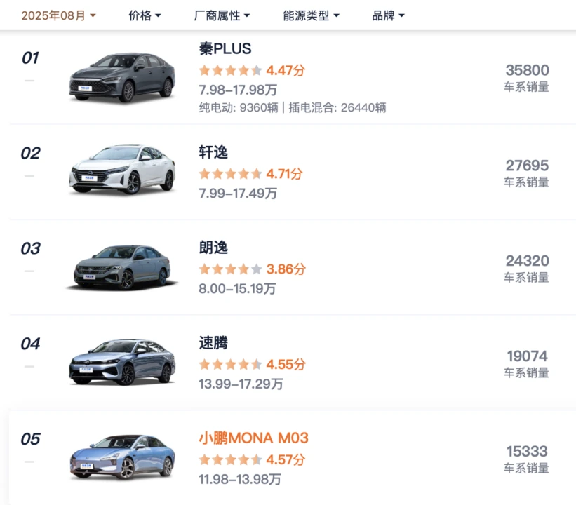 汽车之家的统计显示,今年8月,比亚迪秦全系销量3.58万辆,超过了日产轩逸、大众朗逸等经典畅销车型。降价不仅有助于比亚迪清理库存、实现产品结构调整,也为整个行业的价格战进一步加码。